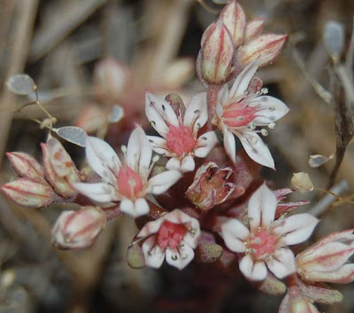 Range today: 9.7-12.7 degrees C. Time of walk ~ 6 p.m. ~11.5 degrees C, humidity 80%, winds W/WSW 16-18 knots. Raining on and off through the day.The red 'leafed' succulent plant that grows by and on flat areas of rock is now in bloom..I think it's Sedum hispanicum or another of the same genus, a stonecrop, family Crassulaceae